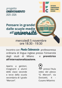 Mercoledì 5 novembre, dalle ore 18:30 alle 19:30, presso la Scuola “G. Marconi”, l’Istituto “E. Fermi” è lieto di offrire ai propri studenti una bellissima opportunità di crescita e orientamento: l’incontro con la Prof.ssa Paola Catenaccio, Prorettrice con delega all’Internazionalizzazione dell’Università degli Studi di Milano e docente presso il Dipartimento di Lingue, Letterature, Culture e Mediazioni.